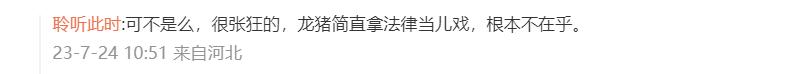 对此,有网友评论表示,“龙猪简直拿法律当儿戏,根本不在乎。”“网络不是法外之地,也应该为自己的言论负责!”也有网友调侃称,“龙猪喜提比亚迪法务部首个点名席位。”“比亚迪法务部放大招,龙猪应声跌倒。”