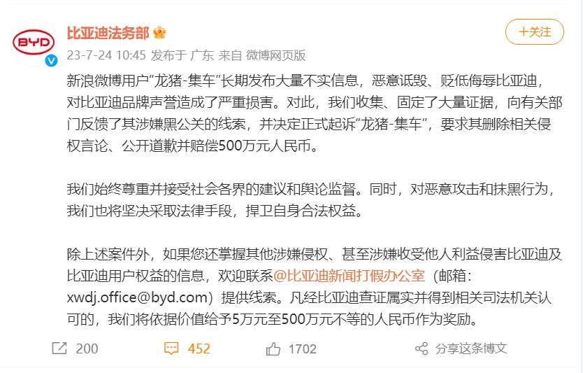 7月24日,比亚迪法务部官微发布首条微博称,新浪微博用户“龙猪-集车”长期发布大量不实信息,恶意诋毁、贬低侮辱比亚迪,对比亚迪品牌声誉造成了严重损害。对此,比亚迪收集、固定了大量证据,向有关部门反馈了其涉嫌黑公关的线索,并决定正式起诉“龙猪-集车”,要求其删除相关侵权言论、公开道歉并赔偿500万元人民币。