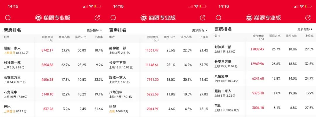 从上映档期来看,《超能一家人》也占尽了“天时”,《长安三万里》《八角笼中》都已经上映两周,《封神第一部》则因为口碑分化、吸引点不足被鉴定为“扑街”,《超能》则被赋予了重新点燃暑期档热情的重任,上映首日排片占比高达36.8%。