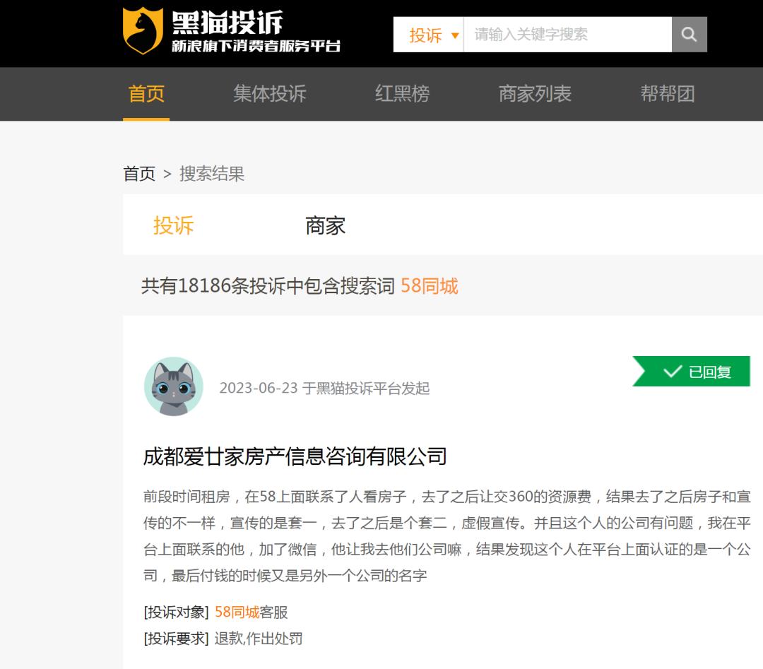 2023年7月22日,时代周报记者在黑猫投诉搜索发现,58同城相关投诉已高达1.8万条,投诉缘由主要为虚假招聘信息,诱导消费、欺诈等,最新1条记录在6月。天眼查上,北京五八信息技术有限公司历史行政处罚6次,而被法院执行金额高达700万。2022年10月,五八同城公司还因司法协助,被北京市朝阳区法院冻结4千余万元一个月。