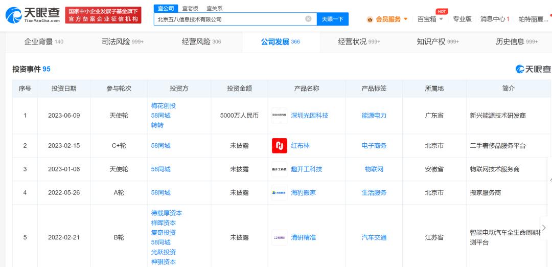 2023年7月22日,时代周报记者查看天眼查发现,仅北京五八信息技术有限公司,名下对外投资记录多达95条,其中最新一条投资发生在上月月初,金额5000万人民币,获得投资的公司是一家深圳新兴能源技术研发商。58似乎转变了投资思维,从投资从生活服务转向新能源领域。