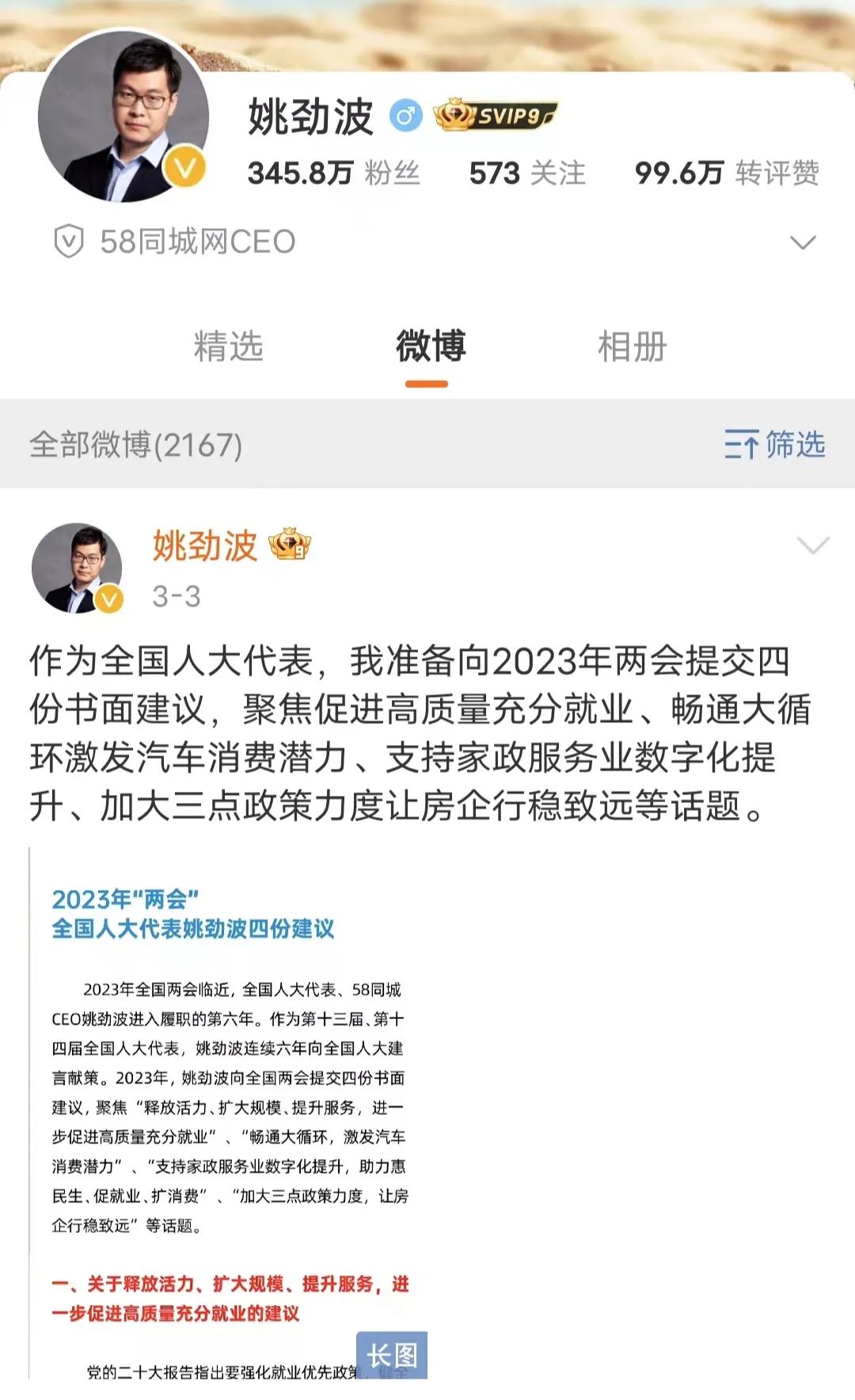 而姚劲波的微博目前唯一对外可见的消息在今年3月,他称要向两会提交4份书面提案,促进高质量充分就业。