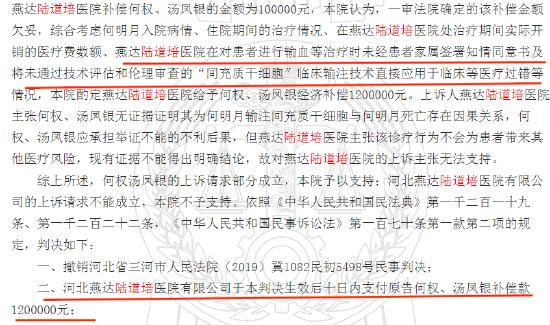 法院认为河北燕达陆道培医院不能证明医院主张该诊疗行为不会为患者带来其他医疗风险,因此责令河北燕达陆道培医院赔偿患者120万元。