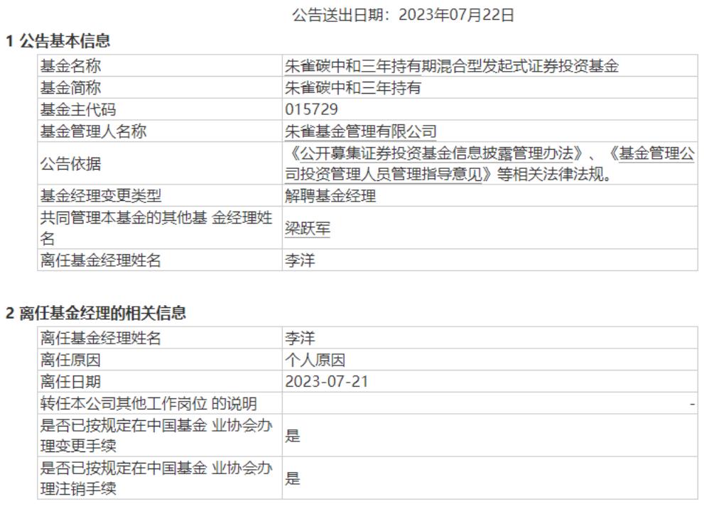 日前,朱雀基金发布基金经理变更公告,李洋因个人原因卸任在管的两只基金,且已按规定在基金业协会办理变更和注销手续。