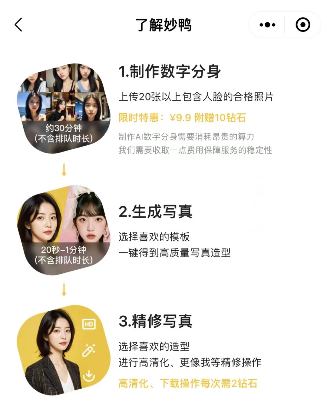 根据记者实测及“妙鸭相机”微信公众号介绍,妙鸭使用教程有制作数字分身、生成写真、精修写真三步。第一步需上传一张正面照以及至少20张上半身照,还需要支付29.9元(限时优惠为9.9元)费用才能真正开始制作数字分身。