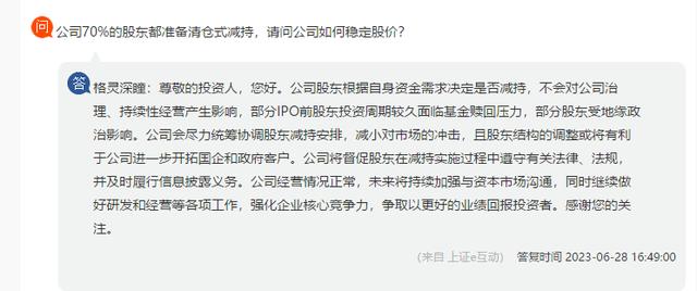 2023年6月12日,一位投资者公开提问称,“公司70%的股东都准备清仓式减持,请问公司如何稳定股价?”