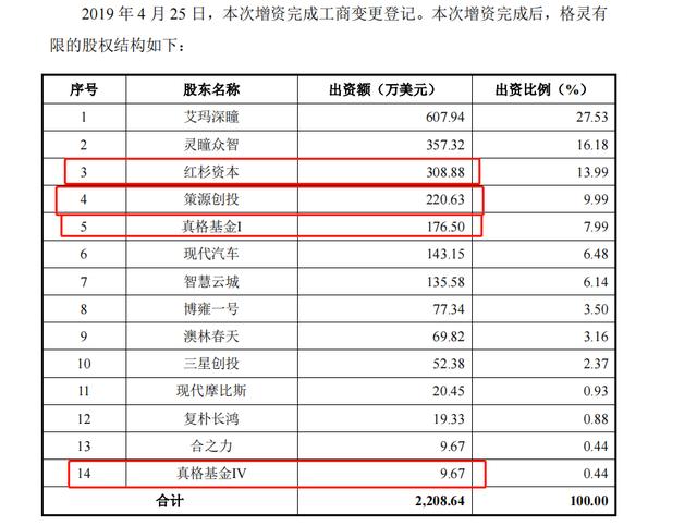 格灵深瞳招股书显示,截至2019年4月份,红杉资本的出资额为308.88万美元,真格基金Ⅰ的出资额为176.50万美元、真格基金Ⅳ的出资额为9.67万美元,策源创投的出资额为220.63万美元。