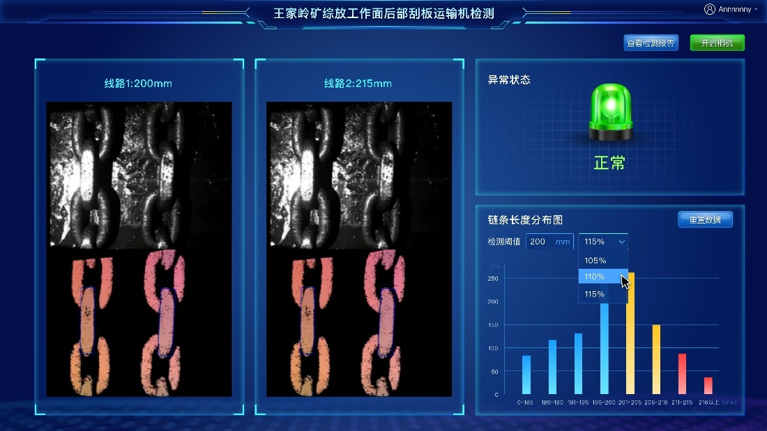 现在,王家岭煤矿的每台刮板输送机上方多出了几台高分辨率3D相机,它们随时捕捉链条外观,并实时识别刮板输送机运行状况。一旦出现异常,工作人员可以立刻获知准确的故障位置,极大提升了刮板机维修效率。