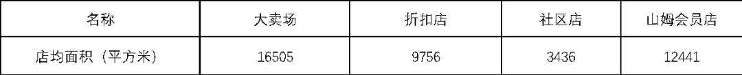 不同业态的门店面积有所差异,大卖场面积最大,平均面积在1.6万平方米,社区店则在3436平方米。