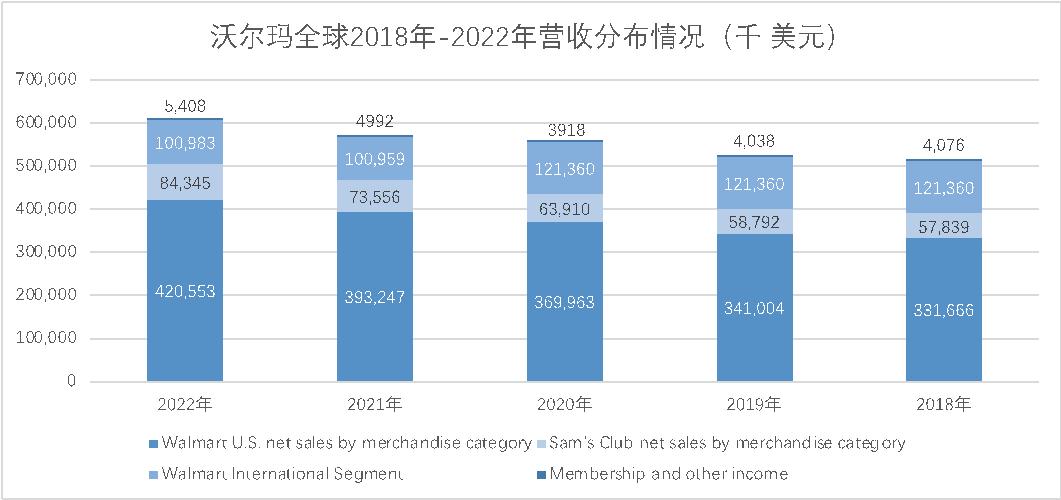 笔者梳理沃尔玛近五年(2018年-2022年)的全球年报数据发现,其全球营收由5144亿美元增长至6113亿美元,复合增长率为4.41%,且始终在全球零售企业中排名第一。