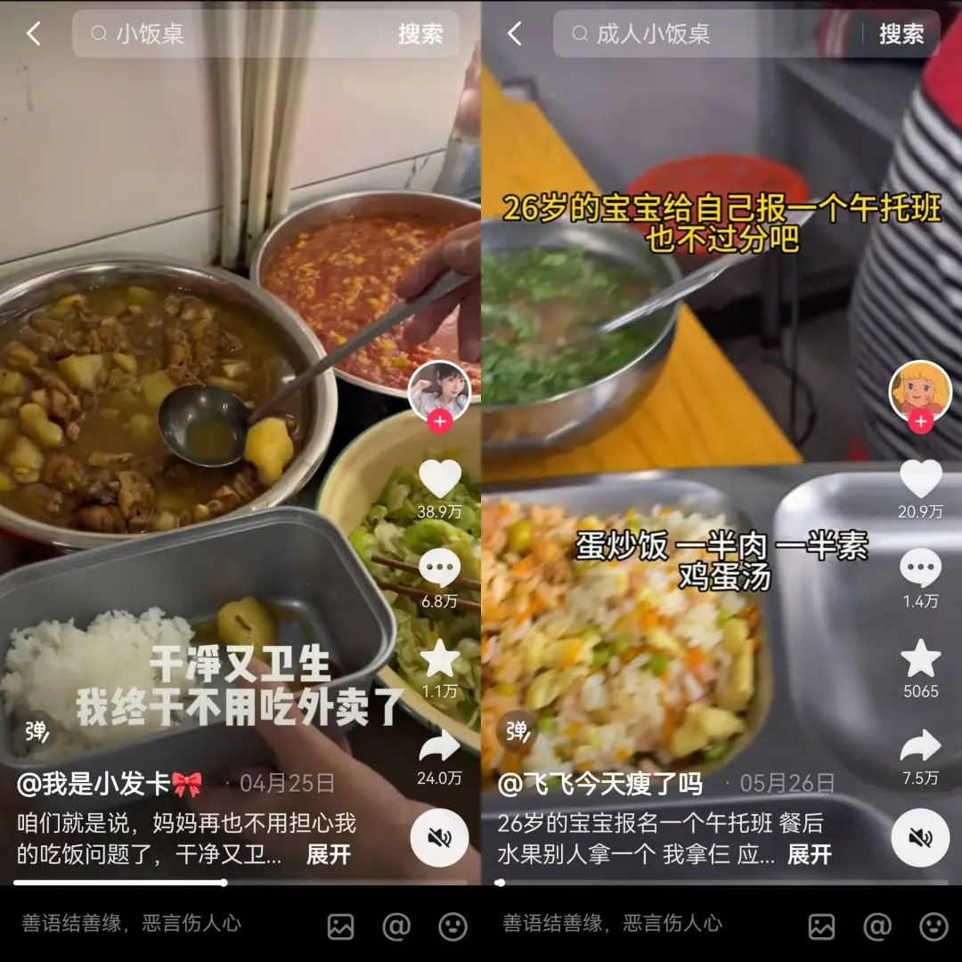 打工人主动和中小学生成为了“饭搭子”,吃着十几块钱一顿的午饭,“健康又卫生”。社交平台让相关话题迅速蹿红:小红书上,和“小饭桌”有关的笔记已经达到了3万多篇;抖音上,#小饭桌#的话题播放量达到了2.1亿次。
