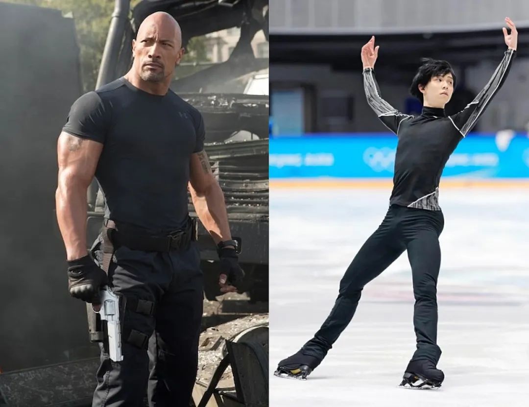 在片场的巨石强森(左)在冰场训练的羽生结弦(右)