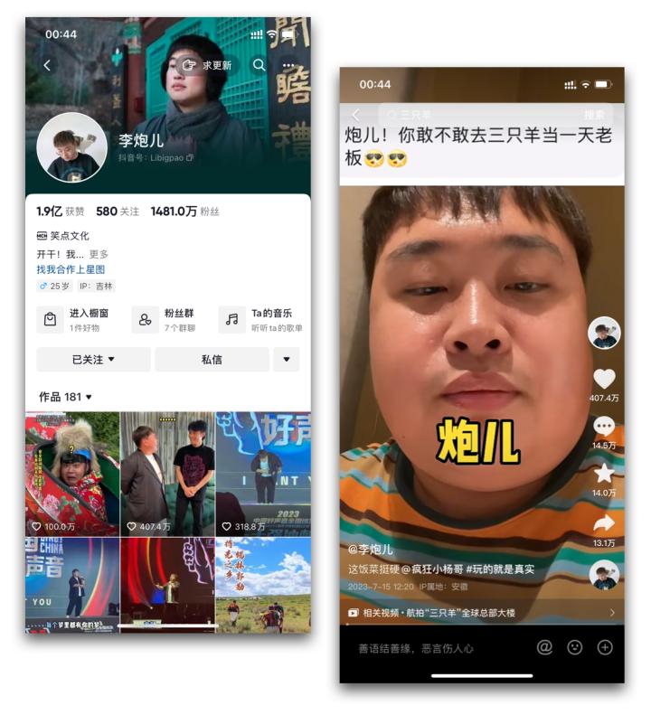 2023年1月1日-6月30日,据新抖数据不完全统计, 抖音达人“李炮儿”累计涨粉1015万! 涨粉量位居抖音上半年第一 !截至目前粉丝量达到1481万!