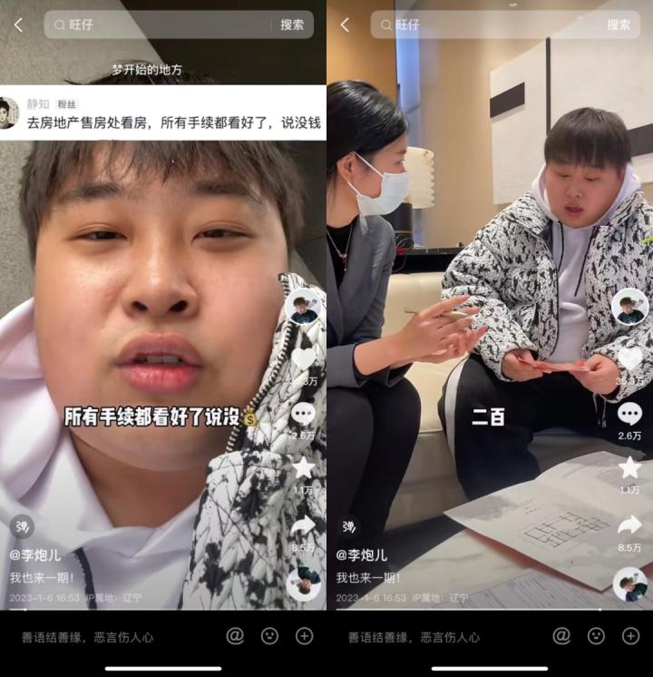 比如:1月初,不足200万粉丝的李炮儿跟风发布了首期“粉丝留言挑战视频”。 在当时,他挑战的是“去房地产售房处看房,所有手续都看好了,说没钱”。视频后段付款签字环节,李炮儿拿出200元现金做首付,惹得工作人员转身就走,他赶忙追上前去解释称是“拍段子”。