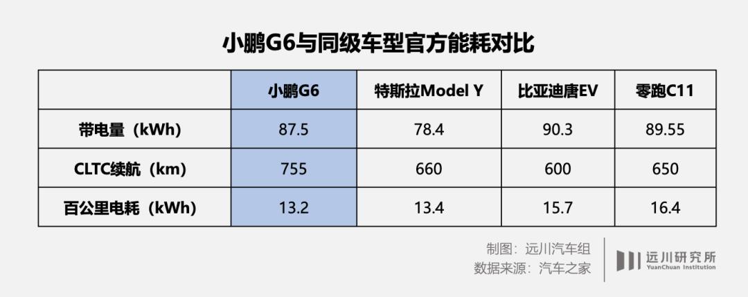 以小鹏G6为例,其CLTC续航580公里、755公里的车型,电池容量分别只有66kWh和87.5kWh,单位电量的续航里程与三电效率极高的特斯拉Model Y不相上下,远超其他同级车型。也就是说,理论上小鹏G6通过800V的高压架构省下了一部分的电池成本。