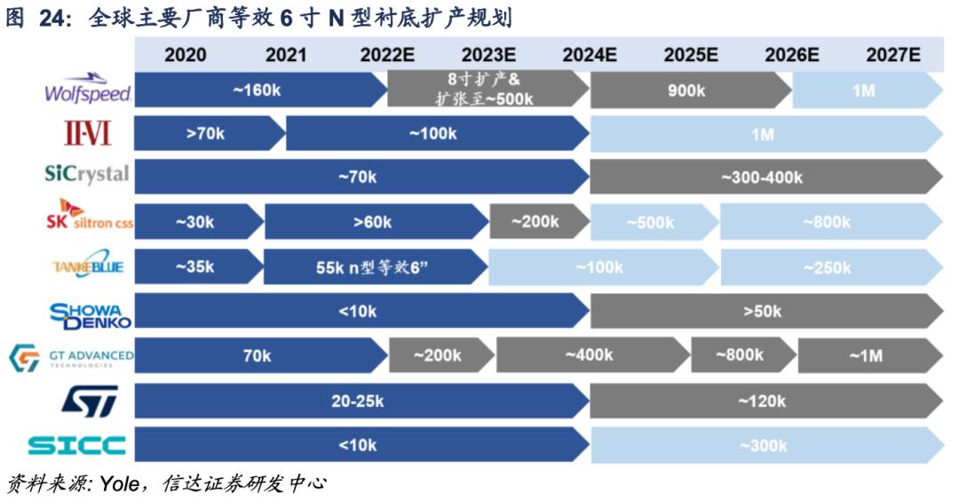 即使到2027年,全球主要厂商6英寸碳化硅衬底年产能也仅在500万片左右