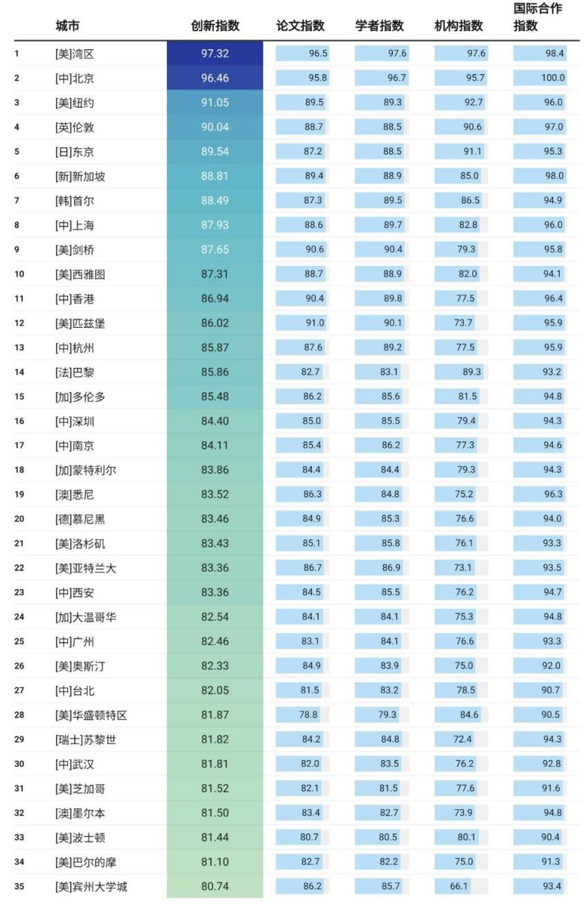据榜单数据显示,北京、上海成功上榜 top 10 名单,其中北京以 96 分的创新指数跻身第二名,上海则以 87 分位列第八名。美国的湾区和纽约优势明显,分列第一名和第三名。