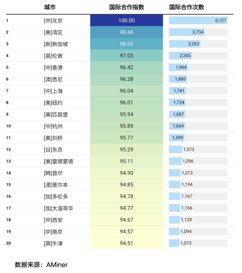 从国际合作指数看,北京超过湾区,以 100 分居第一,国际合作次数为 6127;湾区得分 98.44,国际合作次数为 3734,约是北京的 61%。香港、上海、杭州、西安和南京也位列全球人工智能国际合作指数排名前 20 城市榜单。