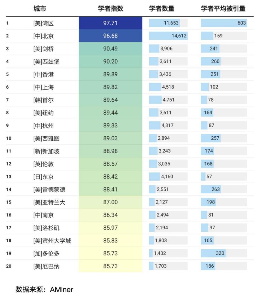 从学者指数的得分看,湾区仍居第一,北京第二,两者得分相差 0.9。北京的学者数量有 15044,是湾区的 1.29 倍;而学者平均被引量是 158,约是湾区的 1/4;排名第三的剑桥,学者指数得分为 90.36。