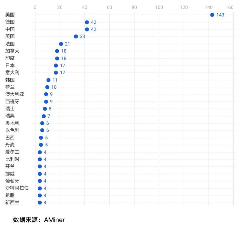 整体上,全球人工智能最具创新力城市 500 强分布在 57 个国家,美国在全球人工智能最具创新力城市的数量和影响力上均处于领先位置,有 143 个城市入围 500 强的榜单,占城市量的 28.6%,中国和德国分别有 42 个城市上榜,英国则有 33 个城市入围。部分上榜国家如下: