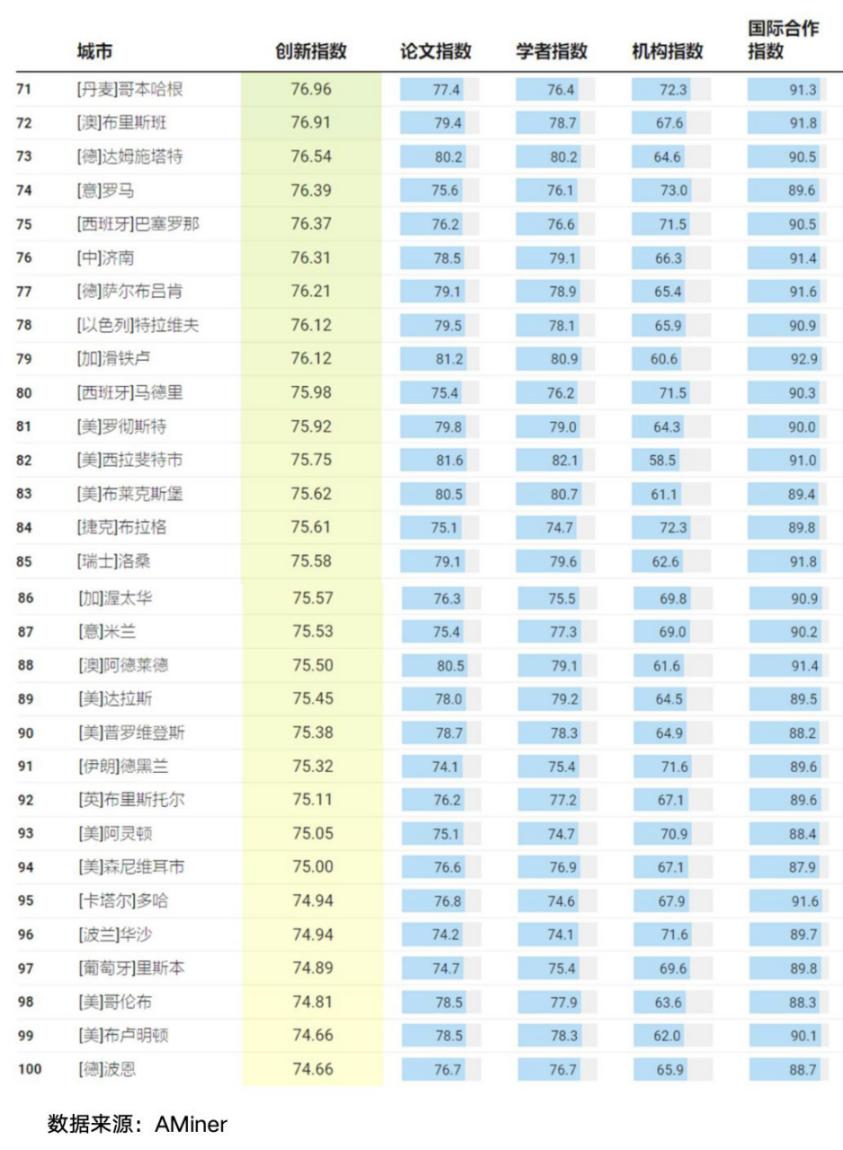 另外,在全球人工智能最具创新力城市榜单前 100 强中,美国有 33 个城市入围,而中国以 19 个城市紧随其后,分别是:
