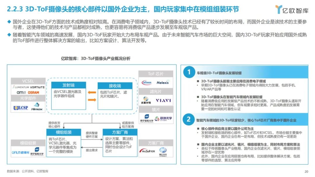 3D-ToF摄像头利用ToF技术得到整幅图像的深度信息,能够获取到目标物之间更丰富的位置关系,也能利用CMOS的特性对物体姿态进行有效判断, 限于分辨率和成本等因素,目前应用场景主要在舱内。