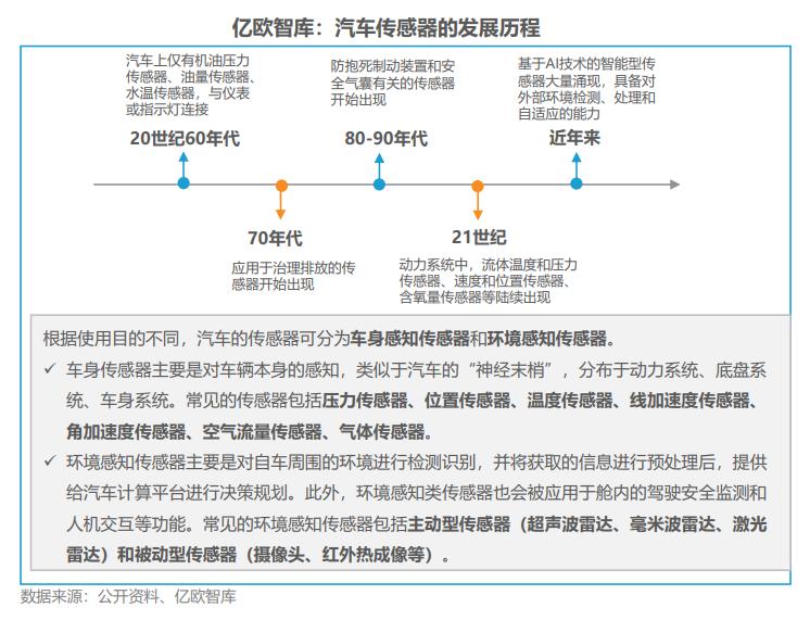 汽车传感器的发展历史悠久,应用范围已从车辆本身延申到了外部环境。从20世纪60年代至21世纪初,各类车身感知传感器陆续出现,比如,燃油车主要以测量压力、油量、水温等传感器为主,而电动车主要以测量电流、气体等传感器为主。