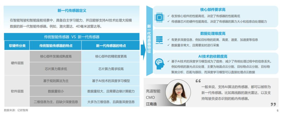 亿欧智库发现,面对多变复杂的感知环境,传统环境感知传感器性能已无法满足更高级别智驾功能和更好人机交互需求。此时,在智能驾驶和智能座舱场景中,出现了一些具备自主学习能力,并且能支持AI技术处理大规模数据的智能传感器,这类传感器可以被称为“新一代传感器”。