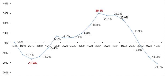 如下图所示。按销售额同比增长率的正负判断,本轮周期从2020年一季度进入上行周期,经过2021年的极度繁荣后,于2022年三季度进入下行周期。迄今整个周期已持续3.5年,其中上行10个季度,下行4个季度。按销售额同比增长率的曲线判断,本轮周期从2019年二季度开始上行,2021年二季度达到波峰;之后进入下行周期。迄今整个周期已持续4年多,其中上行9个季度,下行8个季度。有专家预测,当前或已达下行周期底部附近,有望回升。