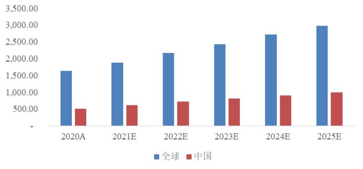 2020-2025年全球/中国乘用车热管理行业空间预测(亿元)