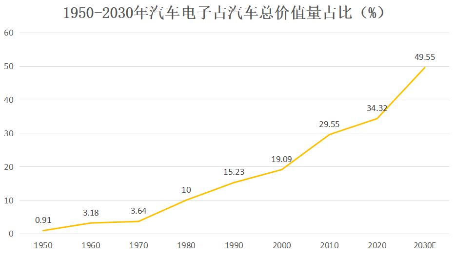 根据中信证券统计,汽车电子成本占整车成本的比例已从上世纪70年代的不足 4%,增长至2020年的30%左右,预计到2030年,汽车电子价值在整车成本价值的占比将高达50%。