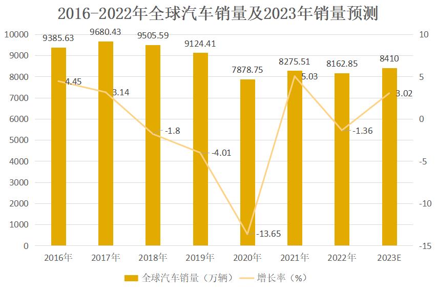 近年来,随着经济社会的发展,汽车产销量实现稳步提升。根据 TrendForce集邦咨询统计,2022年全球汽车销量为8162万辆,同比减少1.36%;在新能源汽车销量的带动下,2023年全球汽车市场销量有望呈现增长态势,达8410万辆,同比增长约3%。
