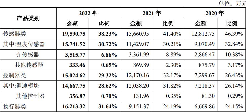 开特股份主营产品以传感器、控制器、执行器等汽车电机类产品为主。2022年传感器产品(温度传感器、光传感器)收入为1.95亿元,占总营收规模的38.23%;执行器产品收入为1.62亿元,占总营收规模的31.64%。近年来,传感器产品占比呈下降趋势,执行器产品占比增速较快。