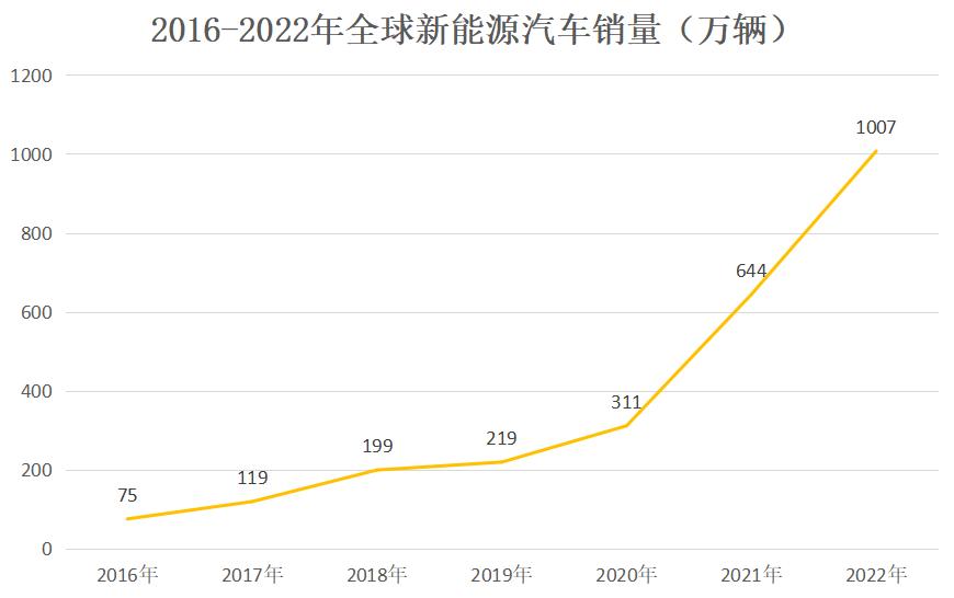 自2019年开始,新能源汽车日益火热。在特斯拉等一线厂商的带领下,新能源汽车销量逐步增长。2020年新能源汽车销量为311万辆, 销售同比增长41.53%;2021年销量为644万辆,同比增长107.45%;2022年销量暴涨至1007万辆。根据EV-Volumes的预测,2023年全球新能源汽车销量有望达到1430万辆。