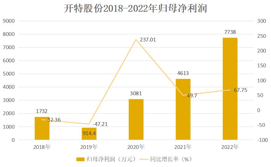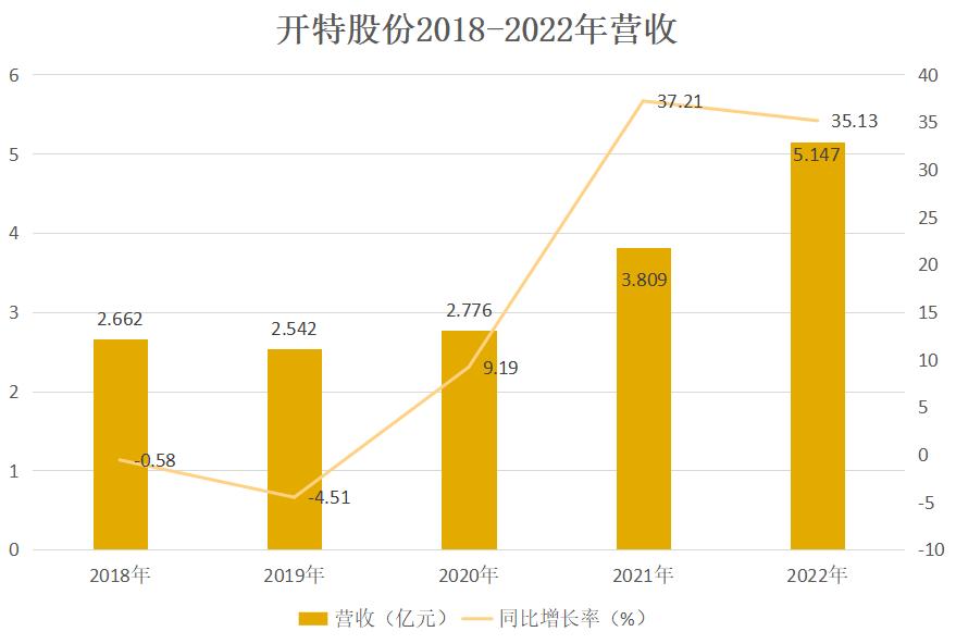 犀牛之星APP显示,业绩方面,开特股份营收由2018年的2.662亿元增长到2022年的5.147亿元,复合增长率为17.91%;归母净利润由2018年的1732万元增长到2022年的7738万元,复合增长率为45.38%。近年来,随着新能源汽车销量的快速拉升,公司传感器产品出货量持续走高,业绩增长较快。