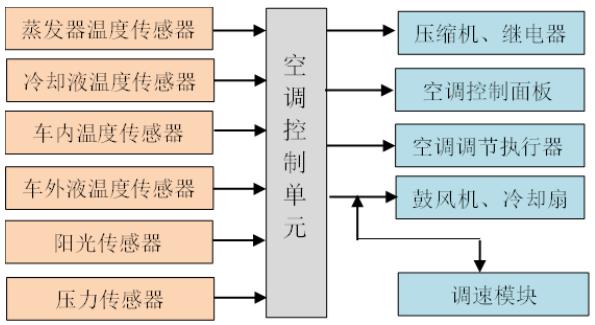 汽车空调通过由各种传感器、电子控制器和执行器组成的电子控制系统实现制 冷、加热、通风循环。