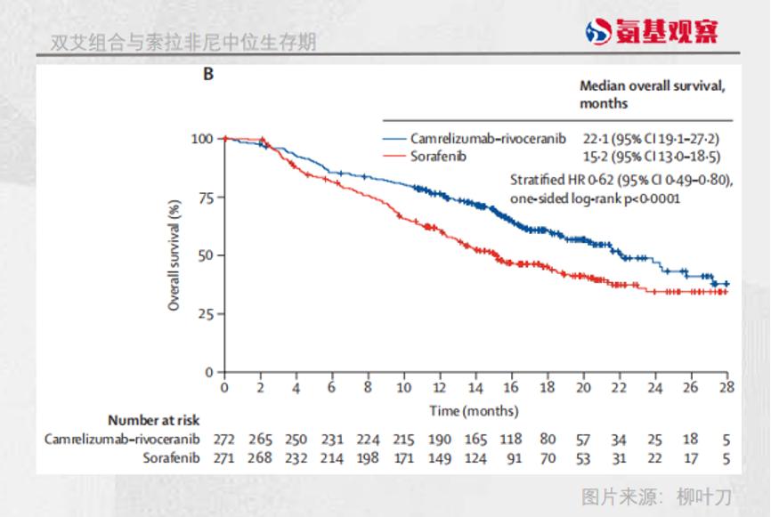 具体来说,双艾组合与索拉非尼的中位PFS分别为5.6个月对比3.7个月,疾病进展或死亡风险降低了48%;而中位OS分别为22.1个月对比15.2个月,死亡风险降低了38%。