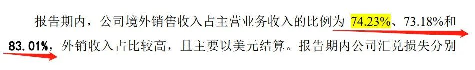 2020-2022年,公司境外销售收入占主营业务收入的比例为74.23%、73.18%和83.01%,外销收入占比较高,且主要以美元结算。