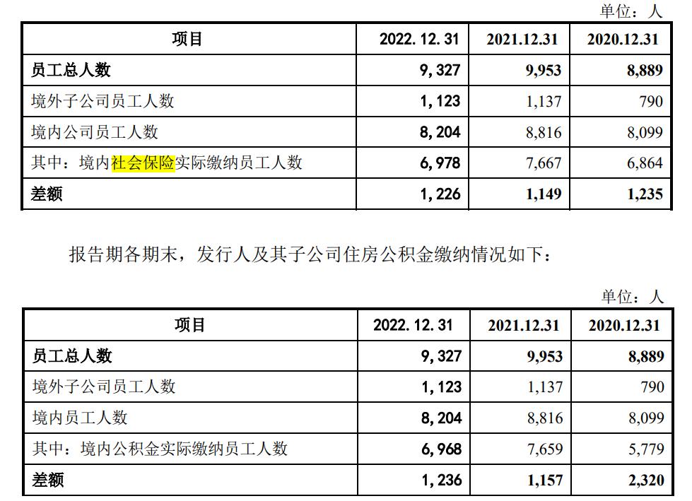 招股书显示,2020-2022年,通力股份境内社会保险未缴纳的员工分别为1235人、1149人和1226人,占境内公司员工人数的15.25%、13.03%和14.94%;住房公积金未缴纳人数则分别有2320人、1157人和1236人,占境内员工人数的比例分别为28.65%、13.12%和15.07%。