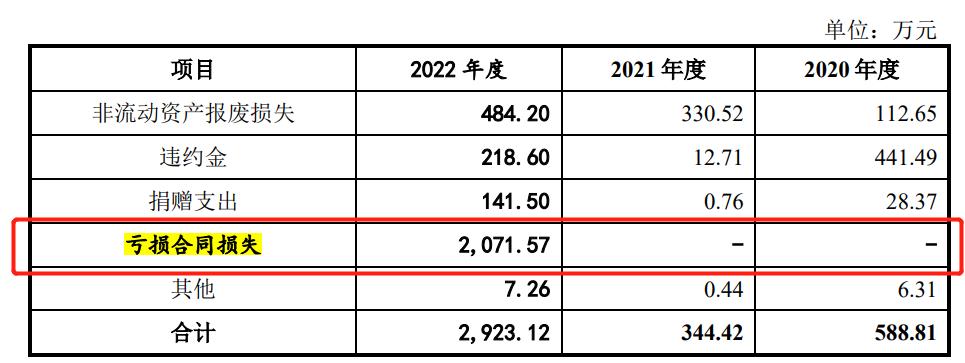 2022年,公司出现亏损合同损失2071.57万元,系公司销售的某批次产品因芯片不良原因导致质量问题,该系列产品订单减少,且客户后续做了产品改型方案,而公司无法取消原有系列产品对应专用物料的采购订单导致。