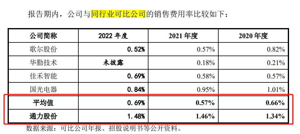 和同行业相比,通力股份的销售费用率颇高。2020-2022年,这一数据分别为1.34%、1.46%、1.48%,远高于行业的平均值0.66%、0.57%、0.69%。