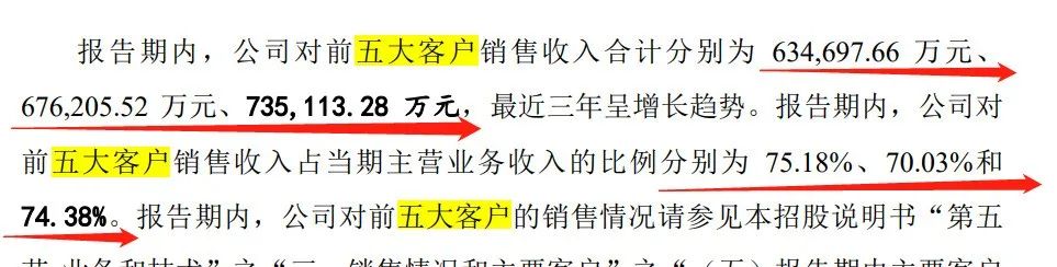 招股书显示,2020-2022年,其来自前五大客户的收入分别为63.47亿元、67.62亿元、73.51亿元,占当期主营业务收入的比例分别为 75.18%、70.03%和74.38%。