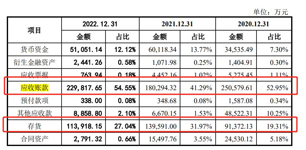 除此之外,通力股份还有高额的应收账款和存货。2020-2022年,其应收账款分别有25.06亿元、18.03亿元和22.98亿元;存货分别为9.14亿元、13.96亿元和11.39亿元。