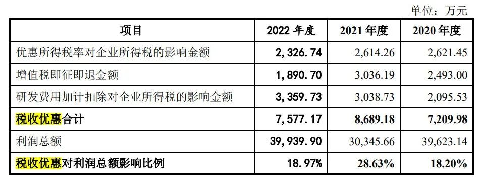 招股书显示,2020-2022年,通力股份享受的税收优惠金额分别为7209.98万元、8689.18万元、7577.17万元,占当期利润总额的18.20%、28.63%、18.97%。