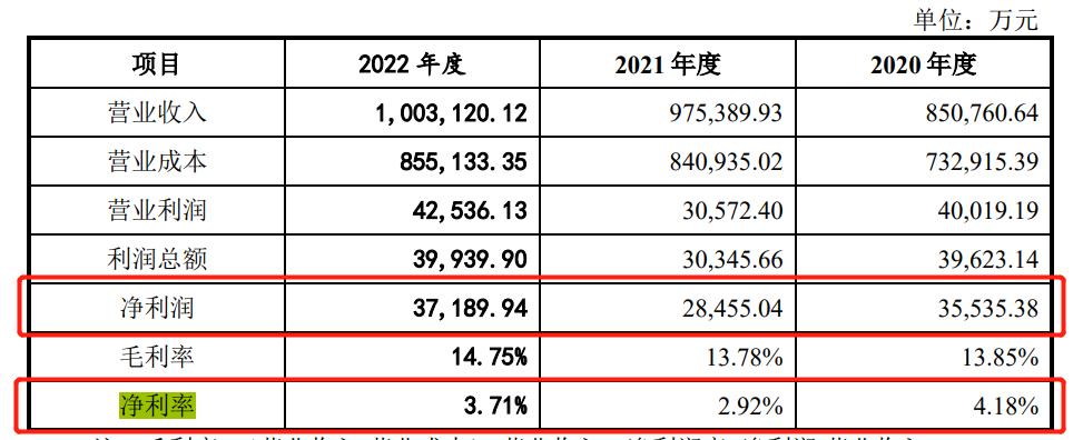 招股书显示,2020-2022年,通力股份净利润仅有3.55亿元、2.85亿元、3.72亿元;净利率低至4.18%、2.92%、3.71%。