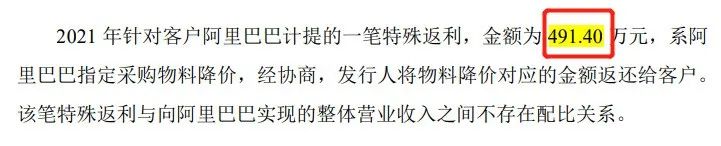 就连物料降价都要将利润返还客户——在2021年,通力股份针对客户阿里计提一笔特殊返利,金额为491.40万元,系阿里指定采购物料降价,通力股份将物料降价对应的金额返还给客户。
