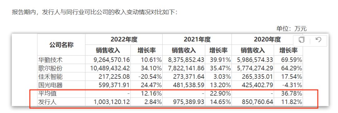 招股书显示,2020-2022年,通力股份的营收增速分别为11.82%、14.65%、2.84%,自身营收增速断崖式下降的同时,还远低于行业平均值36.78%、22.90%、12.16%。
