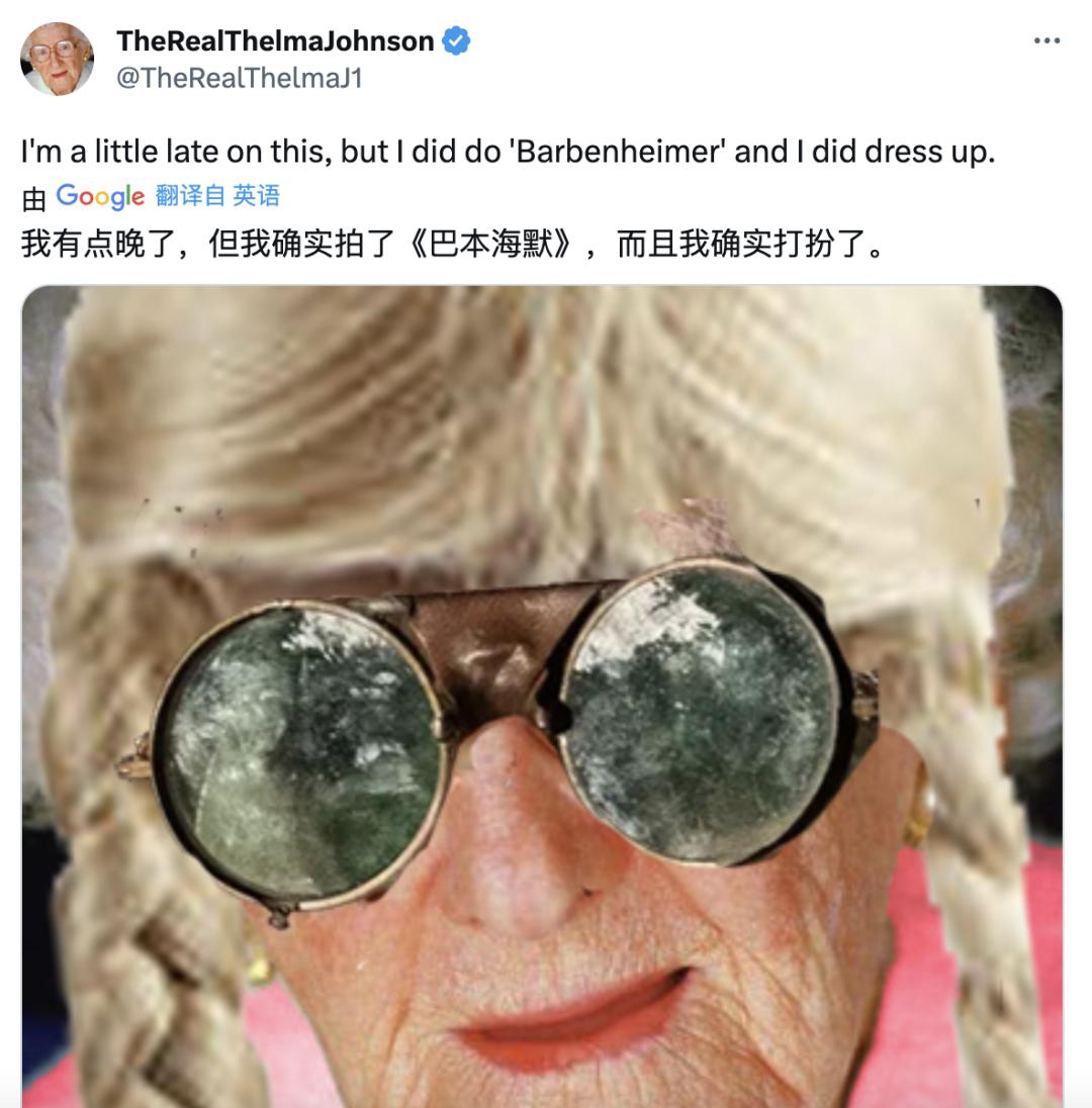 甚至老奶奶也不甘寂寞,结合五毛 P 图抠出了芭米的金色马尾和奥本海默的眼镜元素,搞低配 cosplay 。