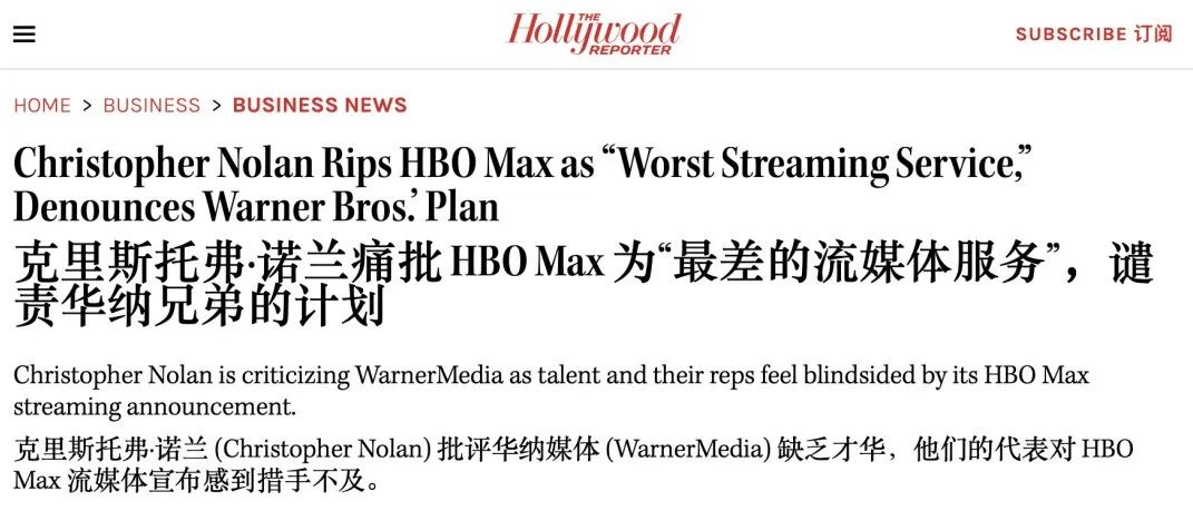 上面写到,诺兰曾和华纳有着 10 多年的发行合作关系,但是前几年,华纳的母公司突然宣布要在流媒体平台 HBO Max 上映 2021 年的所有电影。
