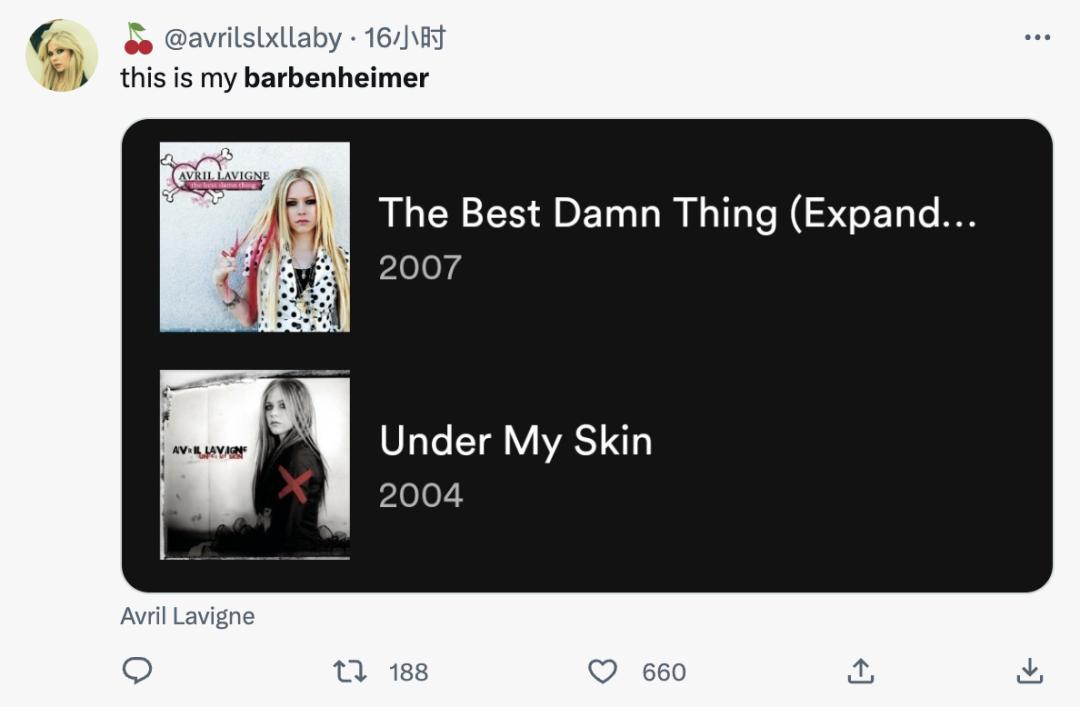 女神艾薇儿没逃过网友的魔爪,两张不同风格专辑的封面,仿佛天生就是用来指代《 芭比 》和《 奥本海默 》。
